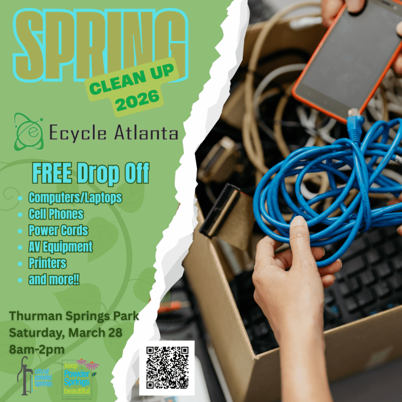 We are happy to partner with Ecycle Atlanta at our Spring Clean Up 2026 at Thurman Springs Park to help our citizens dispose of their old equipment responsibly. This FREE drop off day allows you to bring all of your old electronics for free and safe disposal. All items will be sorted, dismantled, and checked for any data holding devices including, but not limited to hard drive, floppy disks, data tapes, cds, usb thumb drives, tablets, and cell phones.